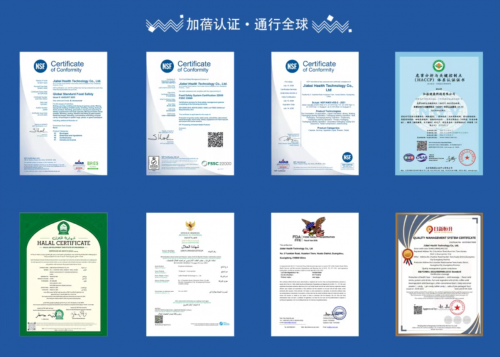 在品质管控与合规保障方面,加蓓健康科技坚守“品质为王”的理念,构建全闭环品质管理体系。公司严格遵循ISO9001、HACCP国际认证标准,持有《食品生产许可证》《保健食品卫生许可证》及SC认证(编号:SC1064401402966),从源头到终端全方位筑牢品质防线。