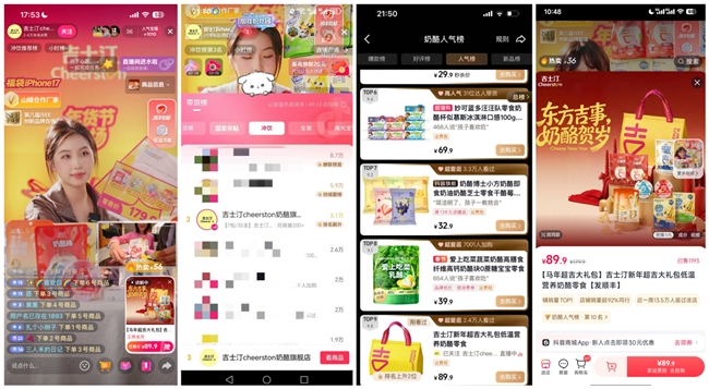 借势“芝士摇”手势舞热度,吉士汀于2月9日开启品牌年货节直播。采用"团播+直播带货"创新形式,将官方直播间打造为集娱乐与销售于一体的新阵地。